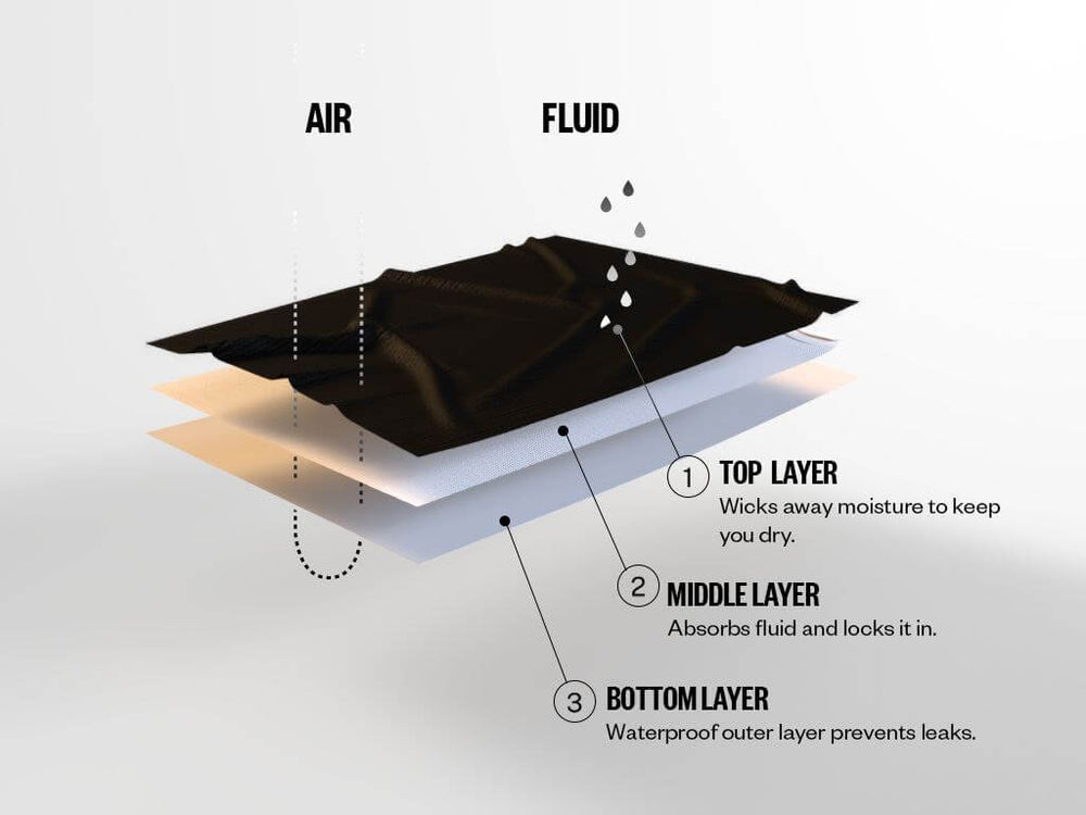 Startide Leakproof Panties use three high-performance layers to absorb fluid, lock in leaks, and keep you feeling dry and fresh all day.
